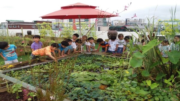 경기 수원시 권선구 권선1동은 지난 16일 이지유치원 원아 50여명을 대상으로 행정복지센터 옥상에 위치한 권선하늘농원에서 자연생태체험 견학 프로그램을 운영했다. 사진은 어린이들이 토마토, 고추, 가지 등 30가지의 작물을 관찰하는 모습.(사진제공=권선구청)