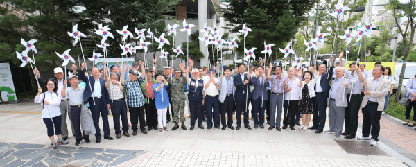 은평구는 8.15 광복 72주년을 맞아 지난 14일 진관동 일대에서 김우영 구청장, 광복회 은평구 지회 및 각 지회의 노인들과 함께 구파발다리, 옥방아다리 등에 태극기 바람개비를 설치했다. 사진은 참여자들이 태극기 바람개비를 들고 기념촬영을 하는 모습.(사진제공=은평구청)