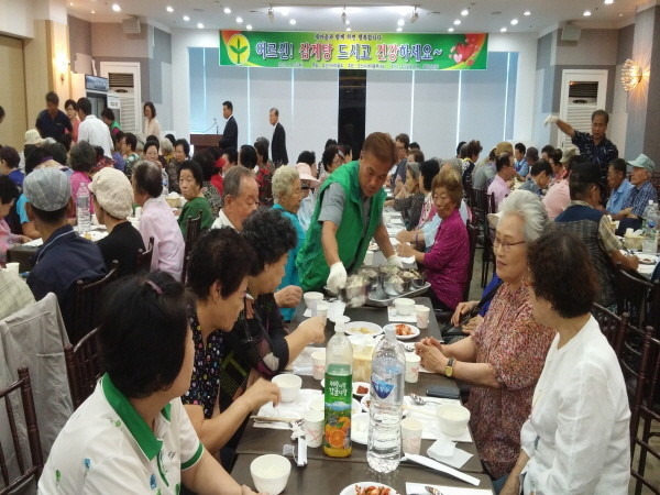 경기 오산시새마을회는 지난 17일 오산 웨딩의전당에서 6개 동 홀몸노인 150여명에게 사랑의 복달임 2차 행사로 삼계탕을 대접했다. 사진은 새마을회 관계자가 노인들에게 삼계탕을 제공하는 모습.(사진제공=오산시청)