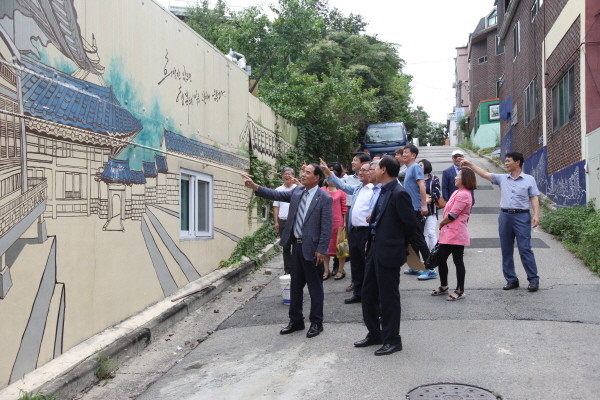 경기 수원시 팔달구는 지난 17일 인계동행정복지센터에서 각 동 주민자치위원장과 사무국장, 인계동 단체장 등 30여명이 참석한 가운데 8월 중 주민자치위원장협의회와 만남의 시간을 보냈다. 사진은 참여자들이 인계동 소재 올레길에서 벽화를 보며 이야기를 나누는 모습.(사진제공=팔달구청)