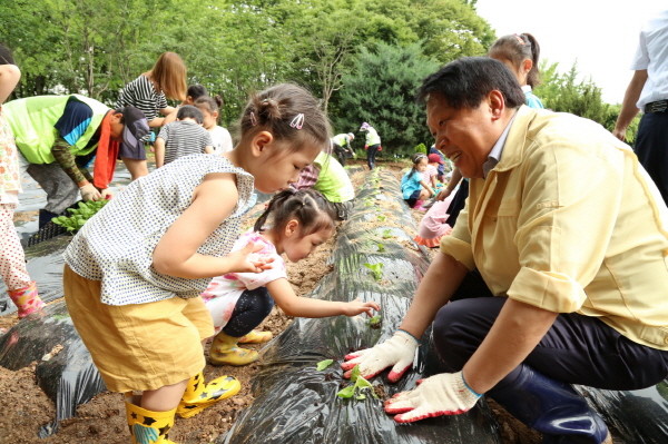 지난 18일 어린이들에게 자연학습의 기회를 제공하기 위해 오류IC 녹지대 유휴부지를 활용한 '도시농업 체험장'에서 열린 배추심기 행사에 참석한 이성 구청장(왼쪽)이 아이들과 함께 구슬땀을 흘리며 배추를 심고 있다.(사진제공=구로구청)