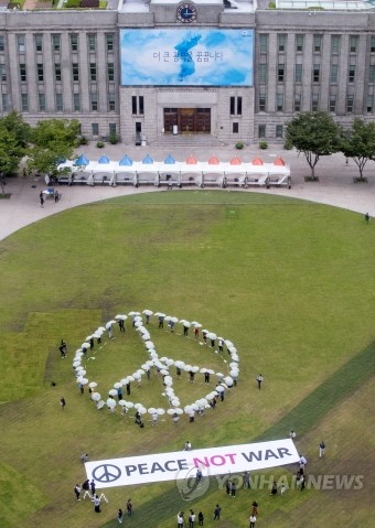 참여연대 등 시민사회단체 회원들이 21일 오후 중구 서울광장에서 한미연합군사훈련인 을지프리덤가디언(UFG)연습 중단을 촉구하며 평화 플래시몹을 선보이고 있다.