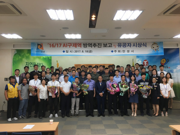 경기 안성시가 최근 안성축협 대회의실에서 2016~2017년 구제역·AI 차단방역에 헌신·봉사한 유공자들에 대한 표창장 수여식을 열고 총 71명에게 시장표창패를 전달했다. 사진은 시상식 후 기념촬영 모습.(사진제공=안성시청)