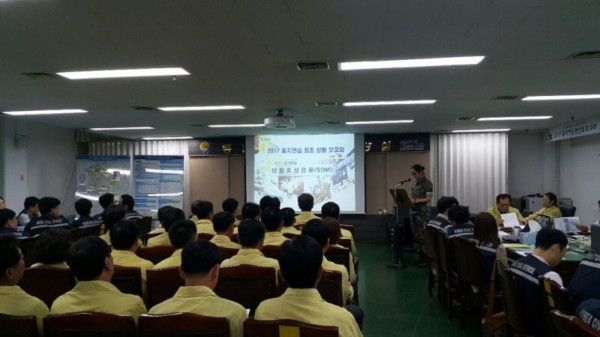 경기 연천군은 21일 을지연습장에서 김규선 군수와 군청내 모든 부서장 등이 참석한 가운데 ‘2017년 을지연습 최초상황보고회’를 개최하고 이번 연습에서 다뤄질 연습 중점사항과 주요상황에 대한 조치방법 등을 논의했다.(사진제공=연천군청)