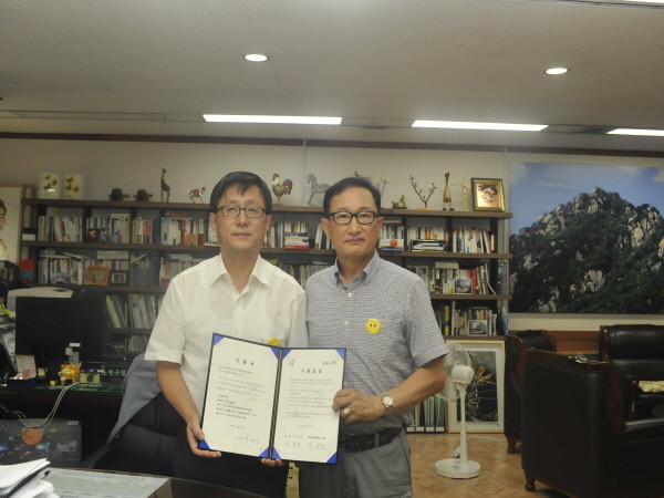 김성환 노원구청장(왼쪽)은 22일 오전 10시 구청장실에서 열린 ‘태능고향풍천장어 앞 정류소 버스 승차대 기증식’에 참석했다. 이날 박영민 태능고향풍천장어 대표(오른쪽)는 공릉동 661-7번지에 버스 승차대를 설치해 기증하기로 했다.(사진제공=노원구청)