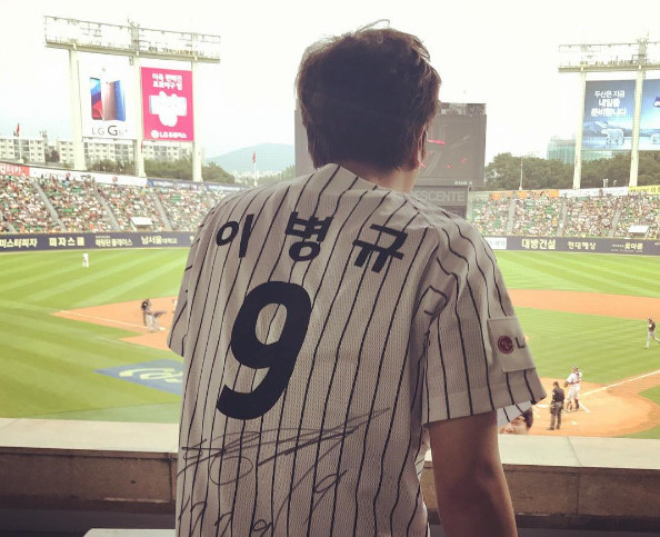 사진 속에서 그는 전 LG 트윈스 야구 선수 이병규의 유니폼을 입고 있는 모습이다.