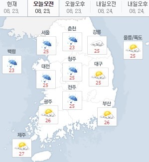 23일 서울 25도, 춘천 23도, 대전 25도, 대구 25도, 전주 25도, 부산 26도, 제주 27도를 기록 중이다.