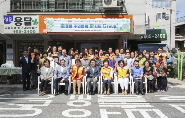 성동구는 지난 22일 송정동에 ‘송정동 주민들의 아지트(Group)’란 의미를 가진 도시재생 희망사업지 주민거점공간인 ‘송아G’를 개소했다. 사진은 송아G 개소식에 참석한 정원오 구청장 등 관계자들이 기념촬영을 하는 모습.(사진제공=성동구청)