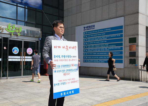 [부천=문찬식 기자] 경기 부천시의회 도시교통위원회 이동현 위원장이 인천 부평구청 정문 앞에서 1인 시위를 벌였다.