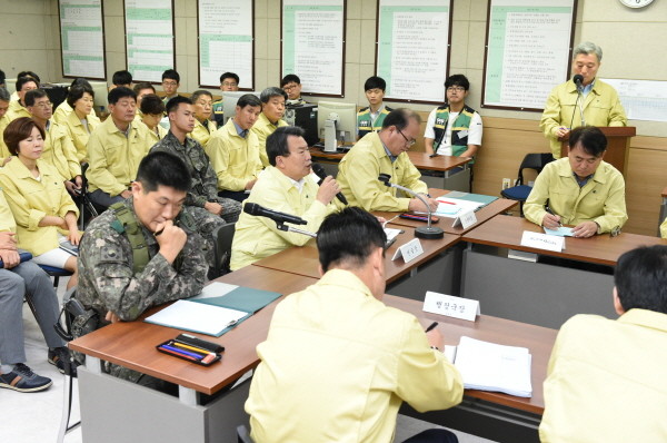 서울 중랑구는 지난 22일 구청 지하 을지연습 종합상황실에서 '2017 을지연습' 일일상황보고회를 개최했다. 사진은 나진구 구청장(가운데)이 주요상황에 따른 조치내용을 보고받은 후 실제 훈련에 반영할 것을 지시하는 모습.(사진제공=중랑구청)