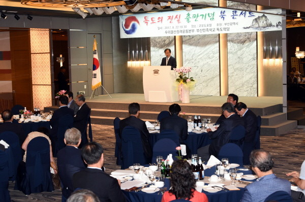 김석준 부산시교육감이 지난 22일 코모도호텔 3층 그랜드볼룸에서 서병수 부산시장, 김건 독도학당 이사장, 김희로 우리물산장려운동본부 이사장 등 내빈이 참석한 가운데 열린 ‘독도의 진실 출판기념 북 콘서트’에서 축사를 하고 있다.(사진제공=부산시교육청)