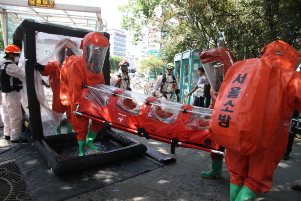 서울 동작소방서는 지난 22일 오후 2시 사당역에서 류희인 행정안전부 재난안전관리본부장이 참여한 가운데 지하철 테러대응 실제훈련을 실시했다. 사진은 119특수구조단이 독가스 오염환자 인명구조 훈련을 진행 중인 모습.(사진제공=동작소방서)