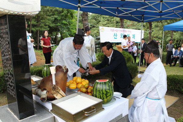 지난 22일 서울 강일동 벌말근린공원 갈산 중턱에서 열린 전통 민간제례 '산치성제'가 개최됐다. 사진은 '산치성제'에 참석한 조동탁 의장(가운데)이 제례 의식을 진행하고 있는 모습.(사진제공=강동구의회)