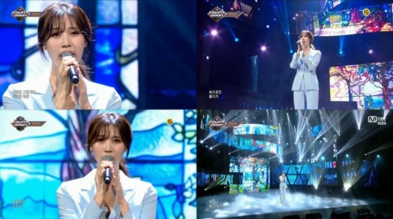 Mnet 음악프로그램 ‘엠카운트다운’에서는 24일 천단비가 ‘오늘따라 조금 더’ 무대를 진행했다. 이때 천단비는 연녹색 정장을 입고 섬세한 가창력을 선보이며 이목을 집중시켰다.