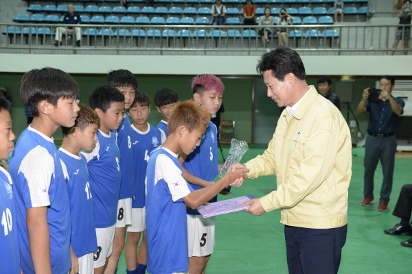 경기 포천시는 지난 23~24일 양일간 한국과 일본, 중국, 동티모르 등 4개국 16개팀이 참가한 가운데 열린 ‘2017 포천컵 국제 유소년 축구대회’를 성황리에 마무리했다. 사진은 김종천 시장이 우승팀인 한국대표(A)팀에게 트로피를 전달하는 모습.(사진제공=포천시청)