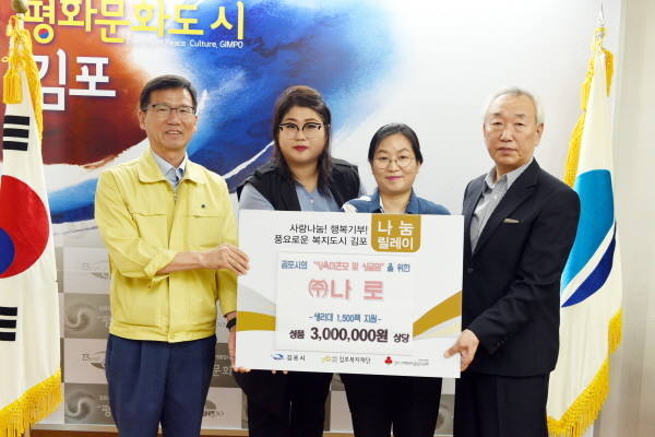 경기 김포시 양촌읍에 소재한 (주)나로는 지역내 양육 미혼모 가구와 한부모 가구의 엄마들을 응원하자는 취지에서 생리대 1500팩(300만원 상당)을 김포복지재단에 전달했다. 사진은 유영록 시장(왼쪽) 등 관계자들이 전달식 후 기념촬영을 하는 모습.(사진제공=김포시청)