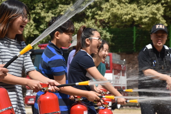동작소방서는 25일 문창초등학교에서 교직원 및 전교생 600여명이 참여한 가운데 안전에 대한 의식을 높이고 각종 재난발생시 대응능력을 향상시키기 위한 화재대피훈련을 실시했다. 사진은 학생들이 소화기 사용 실습을 하는 모습.(사진제공=동작소방서)