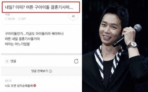 해당 글은 지난 4월 13일 새벽에 작성된 글로 "내일? 이따? 구아이돌 결혼 기사 떠"라며 "여자는 어느 기업 딸"이라고 적혀 있었으나 누구인지는 밝히지 않았다.