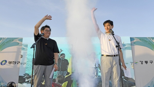 광진구와 강동구가 칠월 칠석날 만나는 견우와 직녀의 전설처럼 구민끼리 광진교에서 만나 정을 나누고 화합을 도모하기 위해 지난 26일 ‘제1회 광진교 페스티벌’을 공동으로 개최했다. 사진은 김기동 광진구청장(왼쪽)과 이해식 강동구청장이 개막 선포를 하는 모습.(사진제공=광진구청)