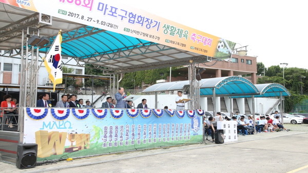 지난 27일 오전 박홍섭 마포구청장이 망원유수지축구장에서 열린 제36회 '마포구협회장기 축구대회'에 참석해 대회에 참가하는 선수들에게 격려사를 건네고 있다.(사진제공=마포구청)