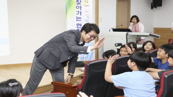 성동구는 지난 25일 오전 서울경일초등학교 어울림홀에서 본교 4학년4반 어린이들을 대상으로 ‘찾아가는 현장구청장실’을 운영했다. 사진은 경일초를 찾은 정원오 구청장이 어린이들과 대화를 이어가고 있는 모습.(사진제공=성동구청)