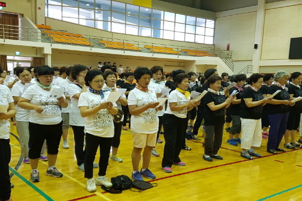 경기 연천군농업기술센터가 최근 한국생활개선연천군연합회원 200여명을 대상으로 연천수레울아트홀에서 한마음수련대회와 회원과제교육을 실시했다. 사진은 강당에 모인 회원들이 프로그램을 진행하고 있는 모습.(사진제공=연천군청)