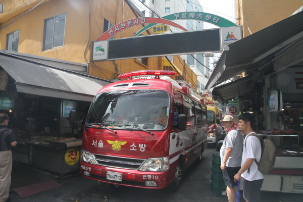 서울 은평소방서는 최근 은평구 주요 교통정체구간 일대에서 소방차 길 터주기 훈련 및 캠페인을 펼쳤다. 사진은 연서전통시장에서 유관기관 및 시민들이 참여한 가운데 소방차 길 터주기 훈련이 진행 중인 모습.(사진제공=은평소방서)