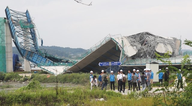 28일 오후 경기도 평택시 국제대교 공사 상판 붕괴 사고 현장에서 국토교통부 건설사고조사위원회 위원들이 현장조사를 하고 있다. /연합뉴스