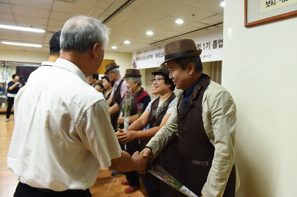 지난 28일 경기 여주시 노인복지관에서 지난 5월부터 진행됐던 1기 바리스타 양성과정 졸업식을 개최했다. 사진은 일렬로 서서 꽃을 받으며 관계자들과 악수를 하고 있는 교육생들의 모습.(사진제공=여주시청)