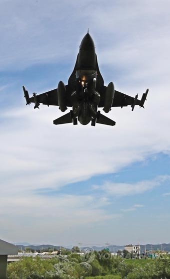 북한이 일본 상공을 통과해 북태평양에 떨어진 중장거리탄도미사일(IRBM)을 발사한 29일 오후 경기도 평택 주한미군 오산공군기지에서 F-16 전투기가 착륙하고 있다.