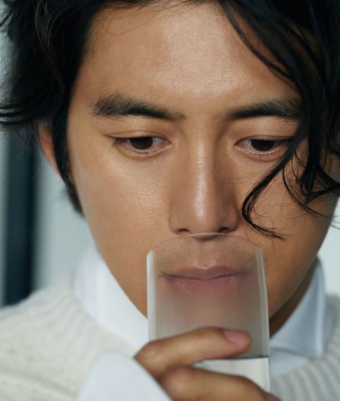 사진 속 고수는 화이트셔츠에 스웨터를 입고 물이 1/3쯤 담긴 컵을 손에 들고 아래를 향해 시선을 던지고 있다.