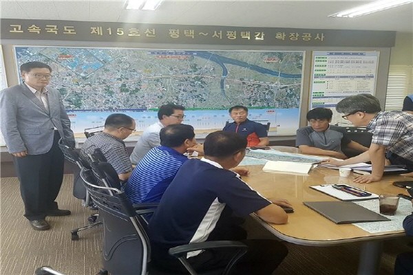 경기 평택시 포승읍사무소가 지난 29일 ‘고속국도 제15호선 평택~서평택 간 확장공사’에 따른 소음·미세먼지 방지를 위한 주민의견·건의사항 전달을 위해 공사 관계자들과 간담회를 실시했다. 사진은 간담회 진행모습.(사진제공=평택시청)