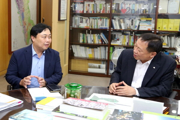 서울 금천구는 지난 30일 서울시 예비 사회적기업인 비앤유 주식회사와 사회공헌 활동 전달식을 가졌다. 비앤유 주식회사는 구 내 지역아동센터 28곳을 대상으로 500만원 상당의 현수막 등을 무료 제작 지원하게 됐다. 사진은 전달식 후 차성수 구청장(오른쪽)과 박종한 이사가 이야기를 나누는 모습.(사진제공=금천구청)