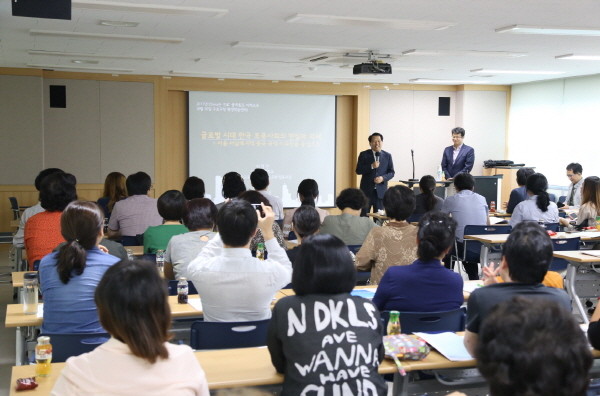 지난 30일 서울 구로구가 다문화에 대한 이해도를 향상시키기 위해 중국동포 이해교육 ‘차이나(China)는 구로’ 특강을 개최했다. 사진은 교육에 참석한 이성 구청장이 강연 전 인사말을 하고 있는 모습.(사진제공=구로구청)