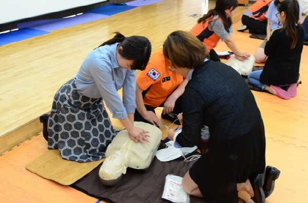 서울 영등포소방서는 지난 30일 오후 2시쯤 영등포구 선유로에 위치한 '선유 정보문화 도서관'에서 도서관 직원 및 도서관 이용시민을 상대로 '찾아가는 소방안전교육'을 실시했다. 사진은 참여자들이 심폐소생술 실습을 하는 모습.(사진제공=영등포소방서)