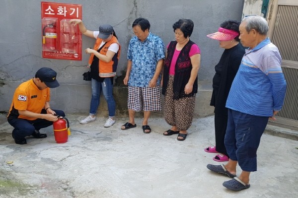 영등포소방서 신길119안전센터는 최근 영등포구 신길동 지역 일대에 '보이는 소화기'를 설치했다. 사진은 소방관이 주민들에게 소화기 사용법에 대해 설명하는 모습.(사진제공=영등포소방서)