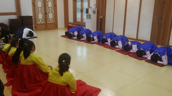 경기 수원시 영통구 매탄4동에서는 최근 지역내 저소득 아동 30여명과 수원전통문화관 예절교육관에서 예절교육프로그램을 체험했다. 사진은 참여 학생들이 배례법에 대해 배우는 모습.(사진제공=영통구청)