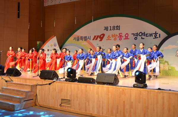 지난 1일 열린 '제18회 서울시 119소방동요 경연대회'에서 영등포소방서 대표로 참가한 초등부 서울 영림초등학교(교장 이선기) 학생들이 소방동요 2집에 수록된 '임금님과 119'를 불러 대상을 수상했다. 사진은 학생들이 공연을 펼치는 모습.(사진제공=영등포소방서)