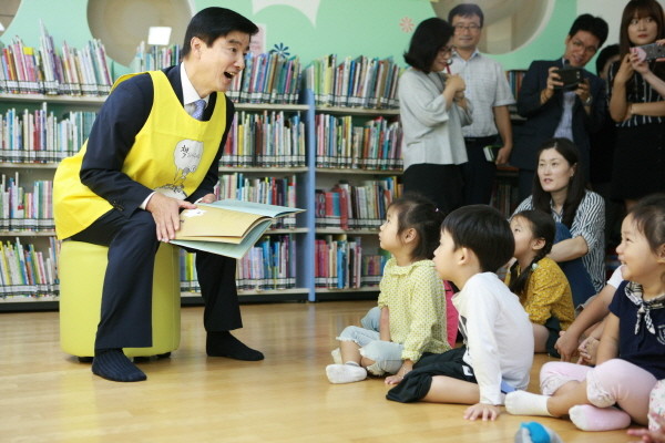이해식 강동구청장은 지난 1일 오전 11시 강일도서관 유아자료실에서 열린 '책 읽어주세요 명사릴레이 행사'에 두 번째 명사로 참여했다. 사진은 이 구청장이 노란 앞치마를 입고 지역어린이집 원생 20여명에게 그림책을 읽어주는 모습.(사진제공=강동구청)