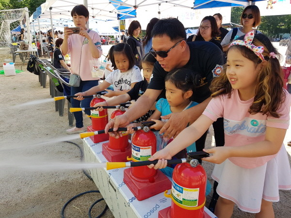 경기 군포소방서는 지난 1일 곡란중학교 운동장에서 열린 '제17회 산본2동 한마음축제'에서 소방체험부스를 운영했다. 사진은 어린이들이 물소화기 사용 실습을 하는 모습.(사진제공=군포소방서)