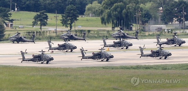 북한의 6차 핵실험 다음 날인 4일 오후 경기도 평택시 캠프 험프리스에 아파치 헬기가 계류돼 있다.