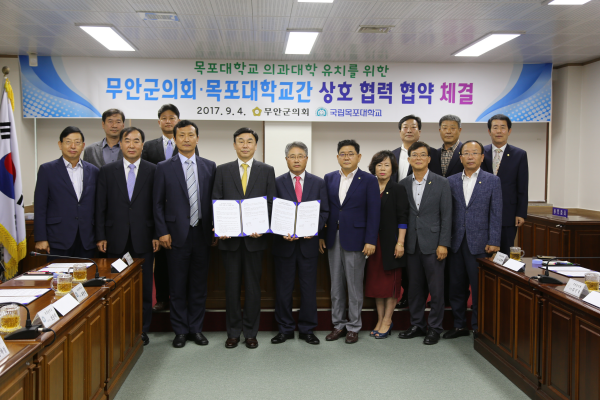 [무안=황승순 기자] 전남 무안군의회와 목포대학교는 지난 4일 군의회 소회의실에서 열악한 전남의 의료환경 개선과 지역주민들의 오랜 숙원인 목포대학교 의과대학의 성공적 유치를 위해 상호협력 협약을 체결했다.