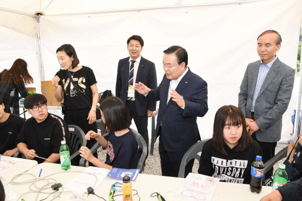 경기 양주시는 지난 2일 경기섬유종합지원센터에서 지역내 청소년 3000여명이 참여한 가운데 ‘2017년 제4회 양주시 청소년 진로박람회’를 개최했다. 사진은 박람회를 방문한 이성호 시장이 청소년들과 이야기를 나누는 모습.(사진제공=양주시청)