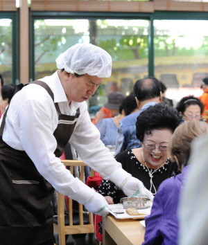 나진구 중랑구청장이 지난 4일 오전 11시에 면목2동에 소재한 시립중랑노인종합복지관을 방문했다. 사진은 나 구청장이 노인들에게 배식 봉사를 하는 모습.(사진제공=중랑구청)