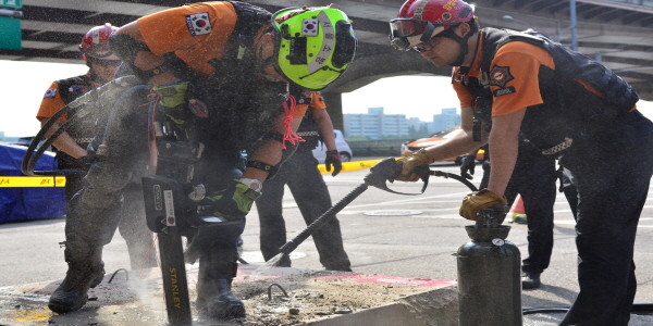 강남소방서 구조대원들은 지난 4일 오전 소방서 차고 앞에서 붕괴사고를 대비해 인명구조기술 배양과 장비조작 숙달을 위한 훈련을 실시했다. 사진은 소방관들이 장비를 이용해 콘크리트를 절단하는 훈련을 하는 모습.(사진제공=강남소방서)