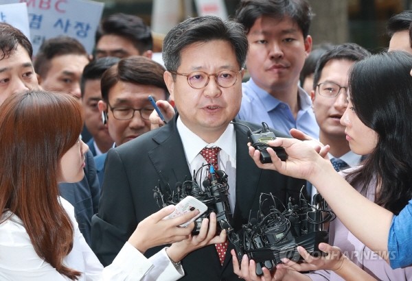 고용노동부의 부당노동행위 혐의 조사에 불응해 체포영장이 발부된 김장겸 MBC 사장이 5일 오전 서울서부고용노동지청에 출석하며 발언하고 있다.