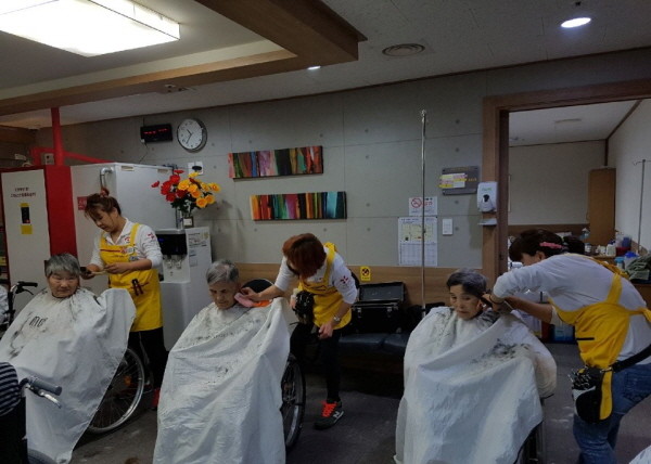 경기 수원시 팔달구에서는 5일 미용업 팔달구지부 봉사단과 함께 거동불편자 및 홀몸노인 130명을 대상으로 노블레스요양원, 빈센트병원 등을 방문해 미용 봉사활동을 펼쳤다. 사진은 참여자들이 노인들의 머리를 손질하는 모습.(사진제공=팔달구청)