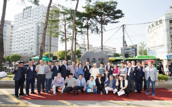 은평구가 최근 응암제1동에서 가로 2.2m, 세로 2m의 규모의 자연석으로 만들어진 '포수말 유래비 제막행사'를 개최했다. 사진은 행사 참석자들이 제막식 후 기념촬영을 하는 모습.(사진제공=은평구청)