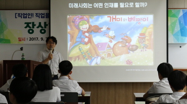 경북도립구미도서관은 지난 7일 선주중학교 1학년 35명을 대상으로 한국교육학술정보원 장상현 공학박사 초청 강연회를 성황리에 개최했다. 사진은 장 박사가 학생들에게 공학자라는 직업에 대한 소개 및 제4차 산업혁명, 빅데이터, 미래의 직업 등에 대해 강의하는 모습.(사진제공=경북도립구미도서관)