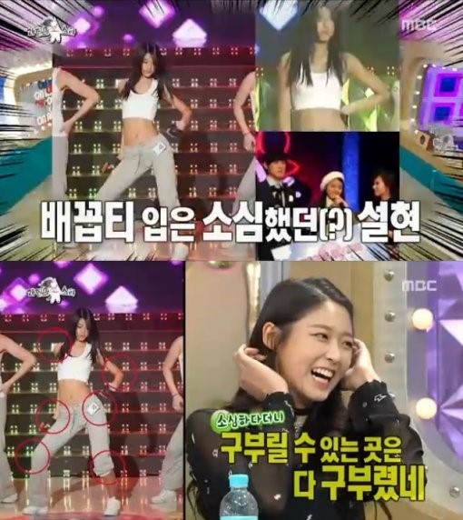 이어 설현이 중학교 2학년 때 배꼽티를 입고 섹시한 포즈를 취한 교복모델선발대회 사진이 공개되자 MC들은 "정말 소심했던 것 맞냐"고 되물어 웃음을 자아냈다.